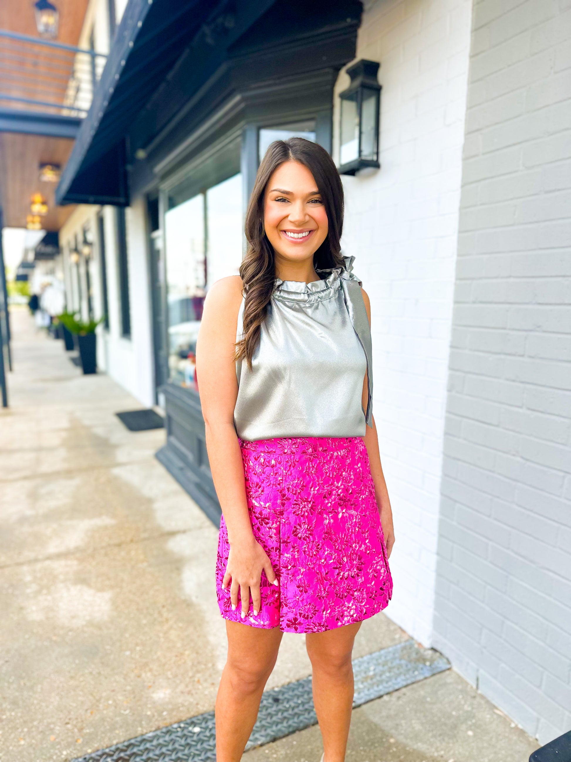 Turn up the color and the confidence. These fuchsia floral bottoms are made to stand out! A classic tweed plaid pattern throughout, shapes this darling skirt that has a high waist and a pleated overlay at the front with flirty. Pair them with nude or blush heels to keep the focus on bold, vibrant style. - Floral - High waisted - Pleated details - Flared skirt - Color: Fuchsia Size + Fit - Model is 5'9" and wearing size XS - Measurements taken from size S - Waist: 13 1/4" - Length: 16"