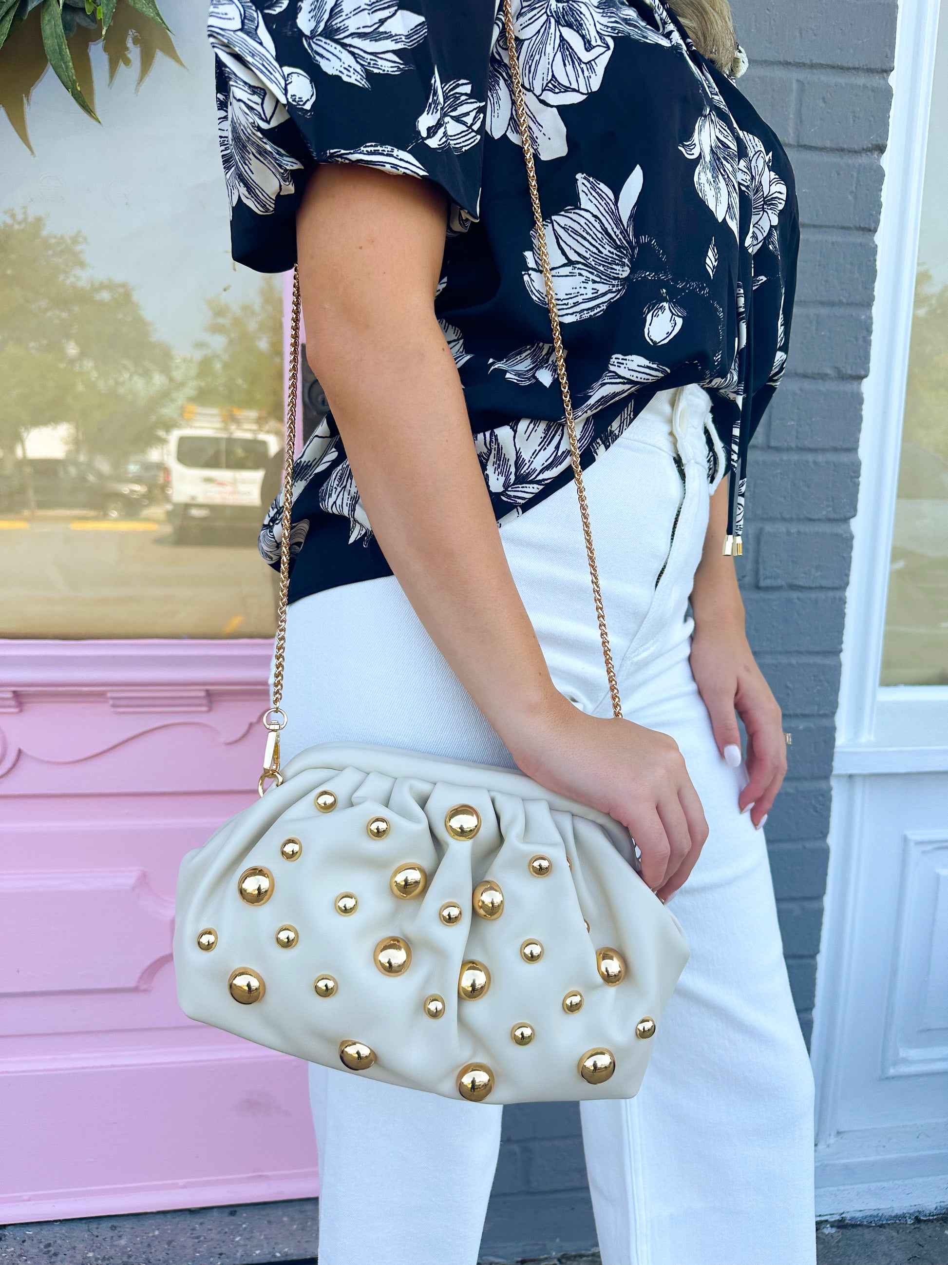 Indulge in luxury with the Carey Crossbody bag! This cream crossbody features elegant gold studs, bringing a touch of sophistication and style to any outfit. Perfect for on-the-go fashionistas who want to make a statement.
