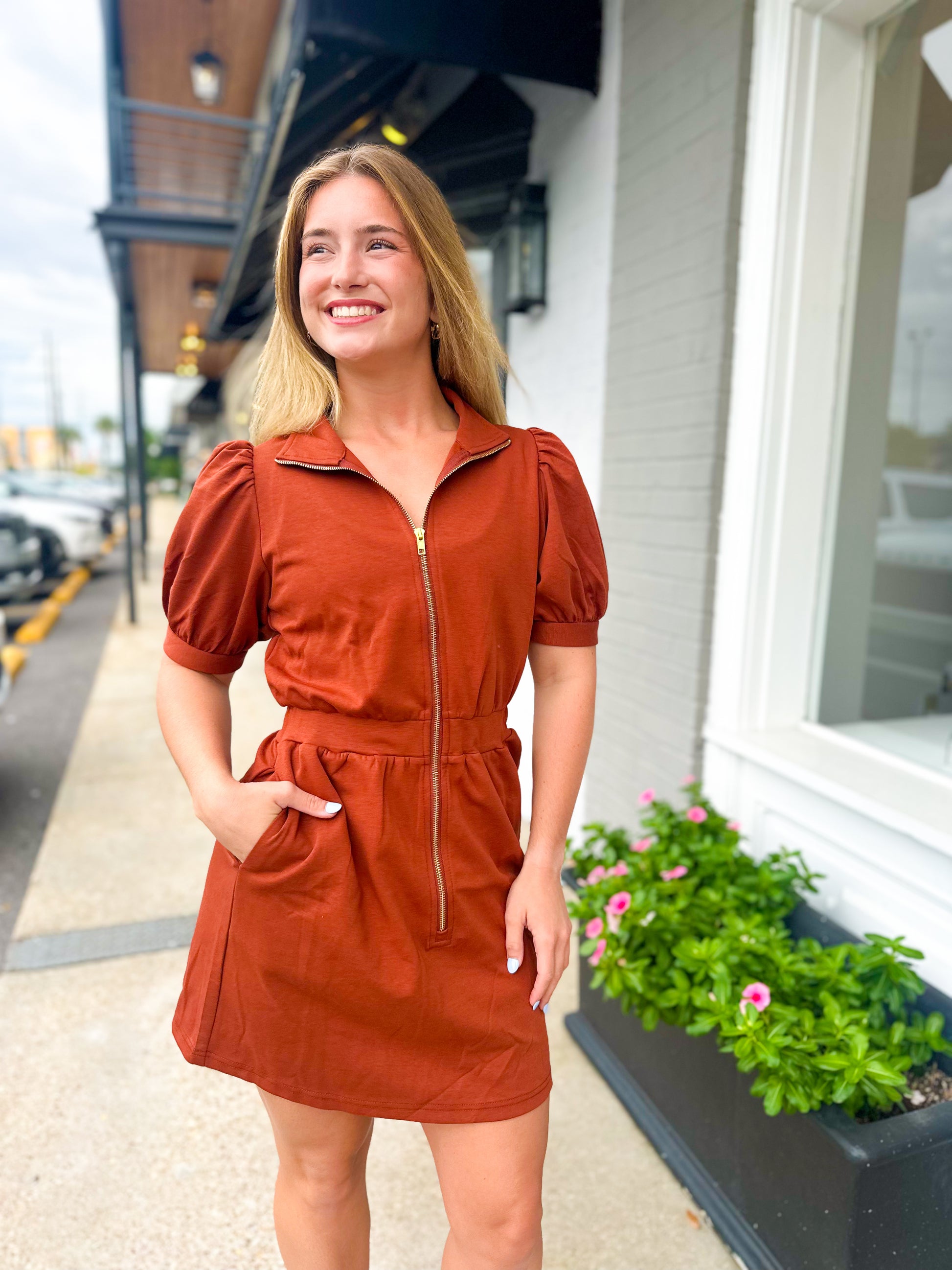 Solid short puff sleeve zip-front high neck pullover mini dress featuring fitted waist. Side pockets. Unlined. Knit. Non-sheer. Lightweight.