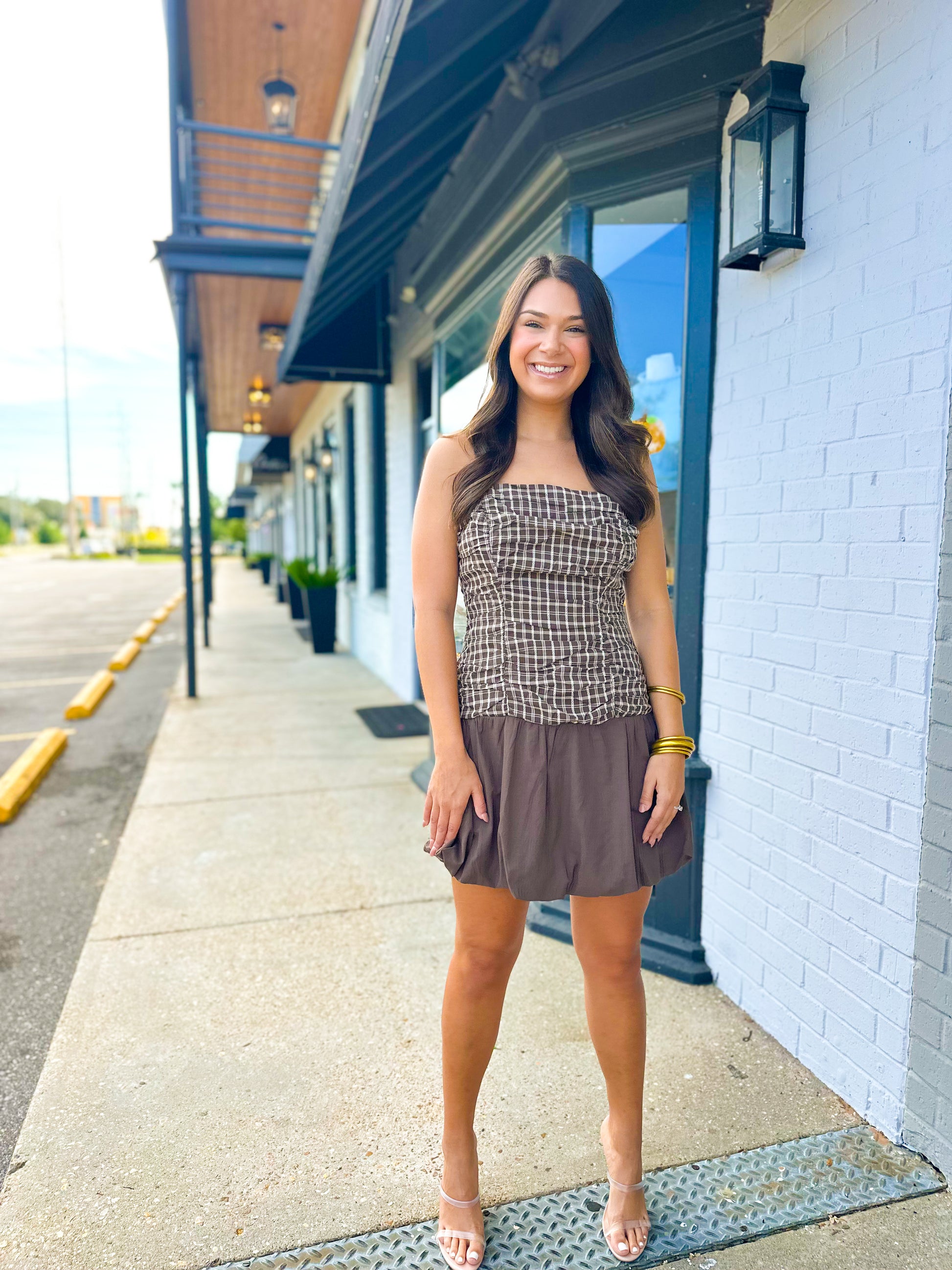 Gingham Ruched Bubble Dress With Tie Shoulders