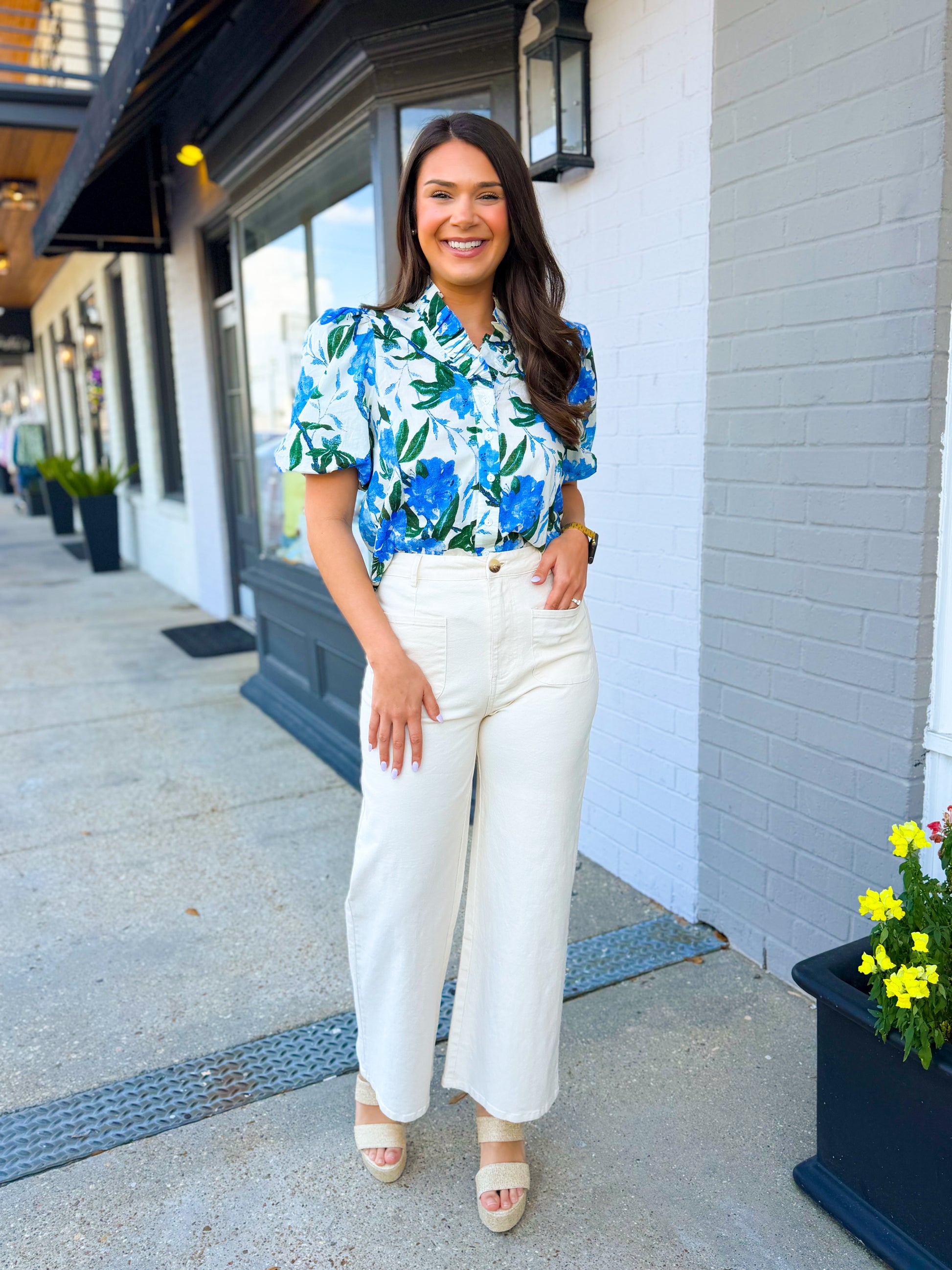 Soft, romantic, and effortlessly polished, the Hydrangea Daydream Top is the perfect blend of classic and feminine style. Featuring a delicate blue floral print on a crisp white base, this top is designed with subtle puff sleeves and a button-front detail that adds timeless charm. The relaxed yet flattering silhouette makes it easy to wear from day to night.