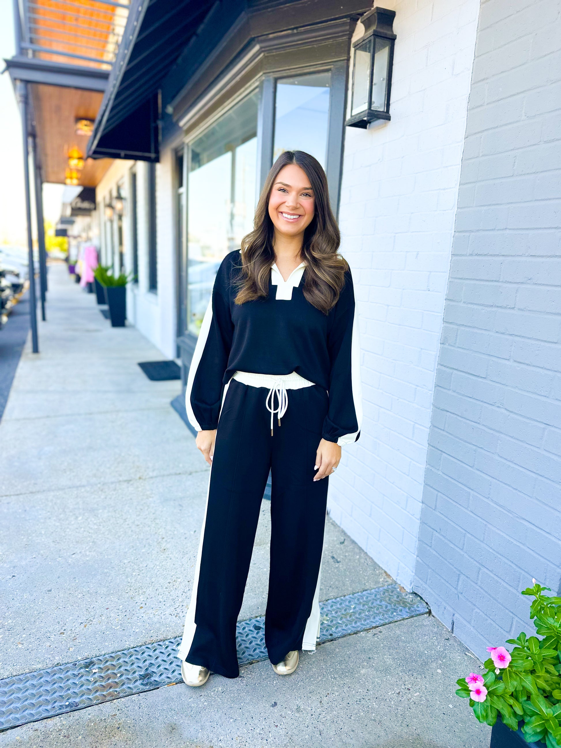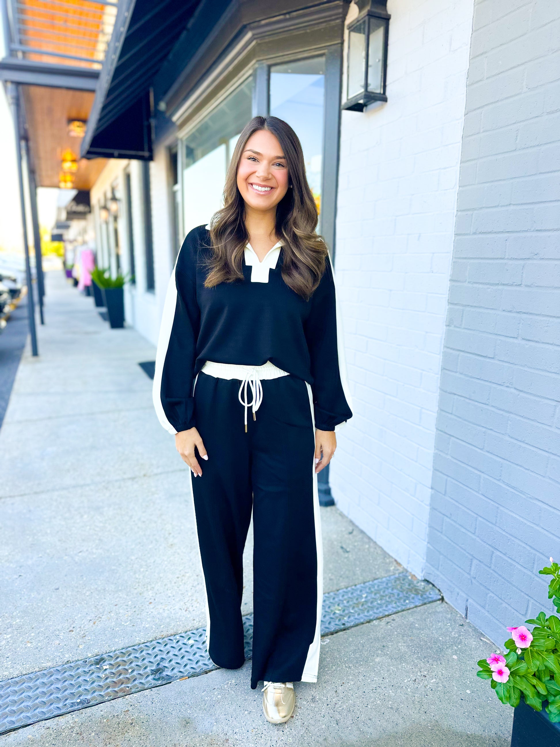 Solid long sleeve knit set featuring contrast collar and contrast stripe detail at sleeves. Side slits at hem. Elasticated sleeve openings. Unlined. Knit. Non-sheer. Lightweight.