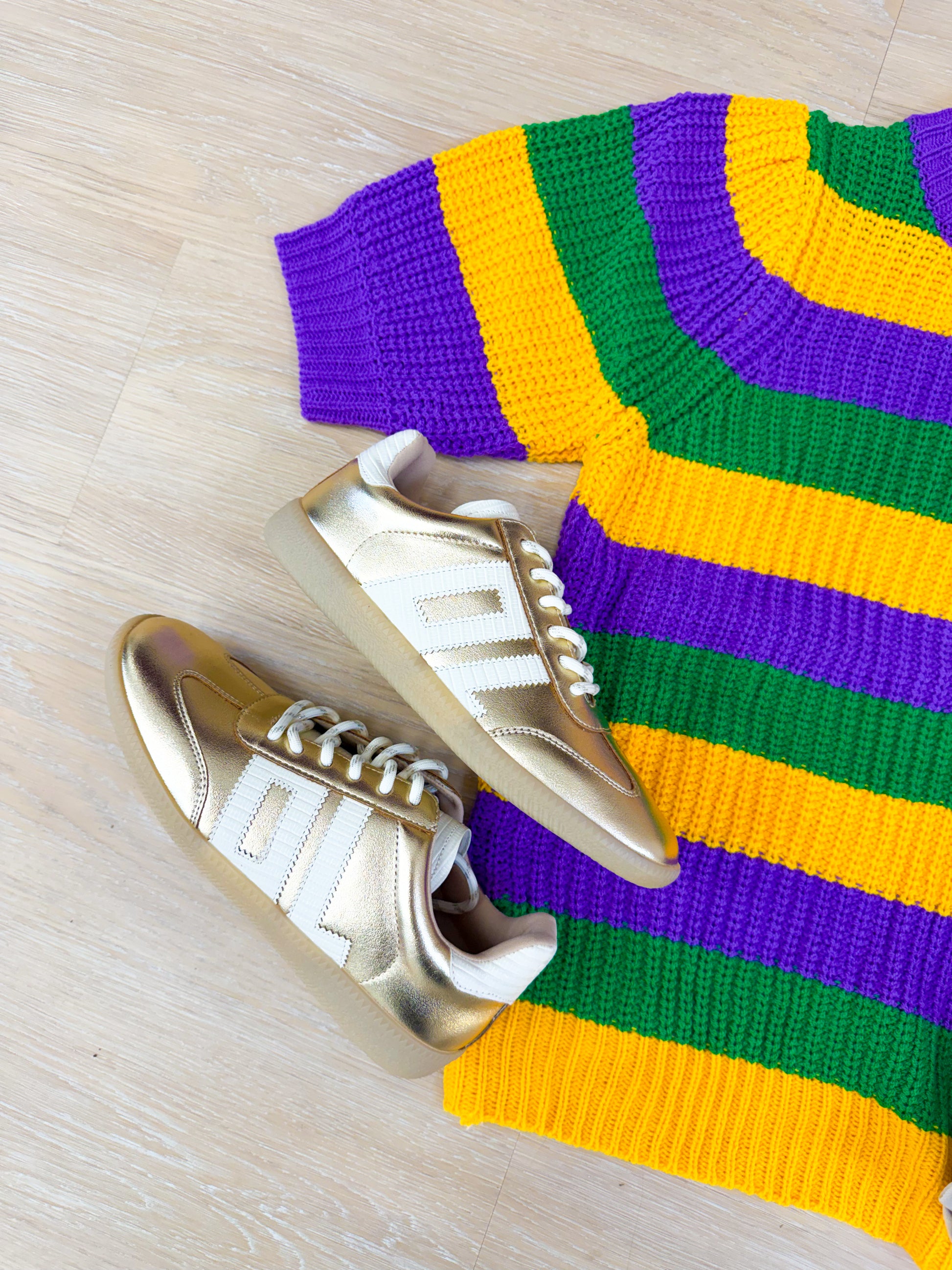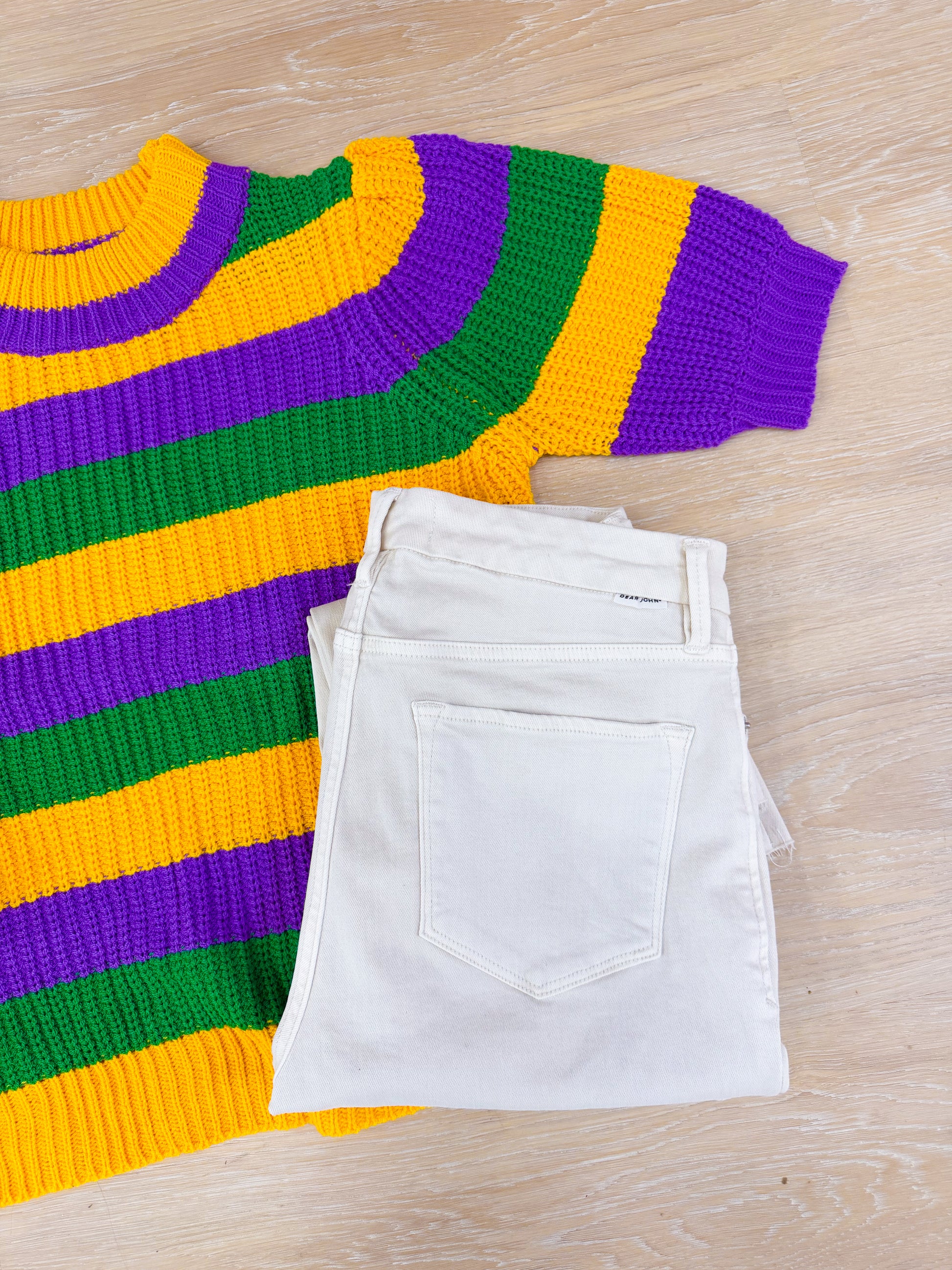 Celebrate Mardi Gras style with this festive striped knit top featuring bold purple, green, and gold hues. Designed with a soft, textured knit and short sleeves, this lightweight sweater is perfect for layering or wearing on its own. The relaxed fit makes it easy to dress up or down, pairing effortlessly with white denim, jeans, or skirts. While it’s a standout choice for Carnival season, the classic stripe pattern and cozy feel make it a versatile piece you’ll reach for all year long.