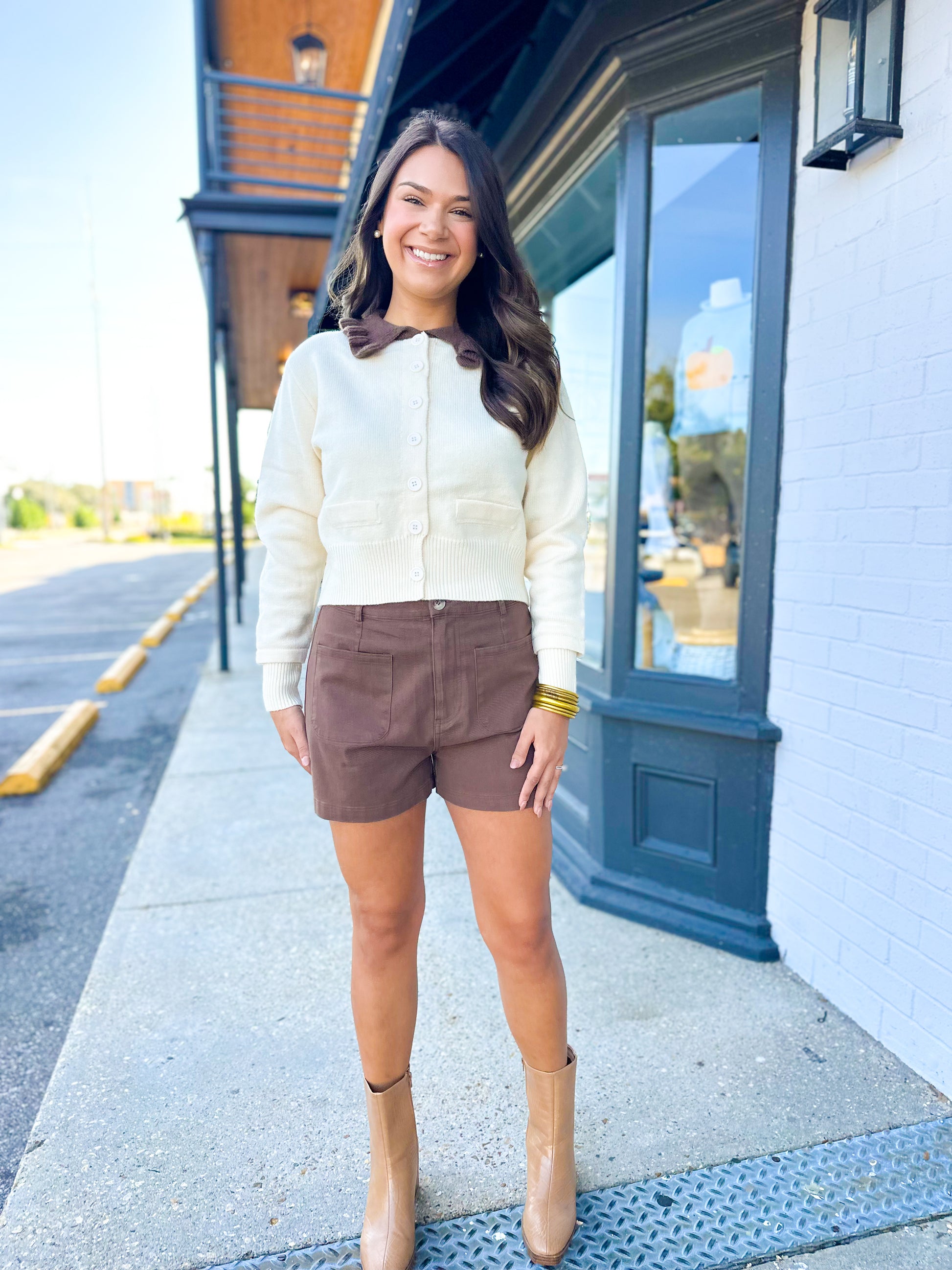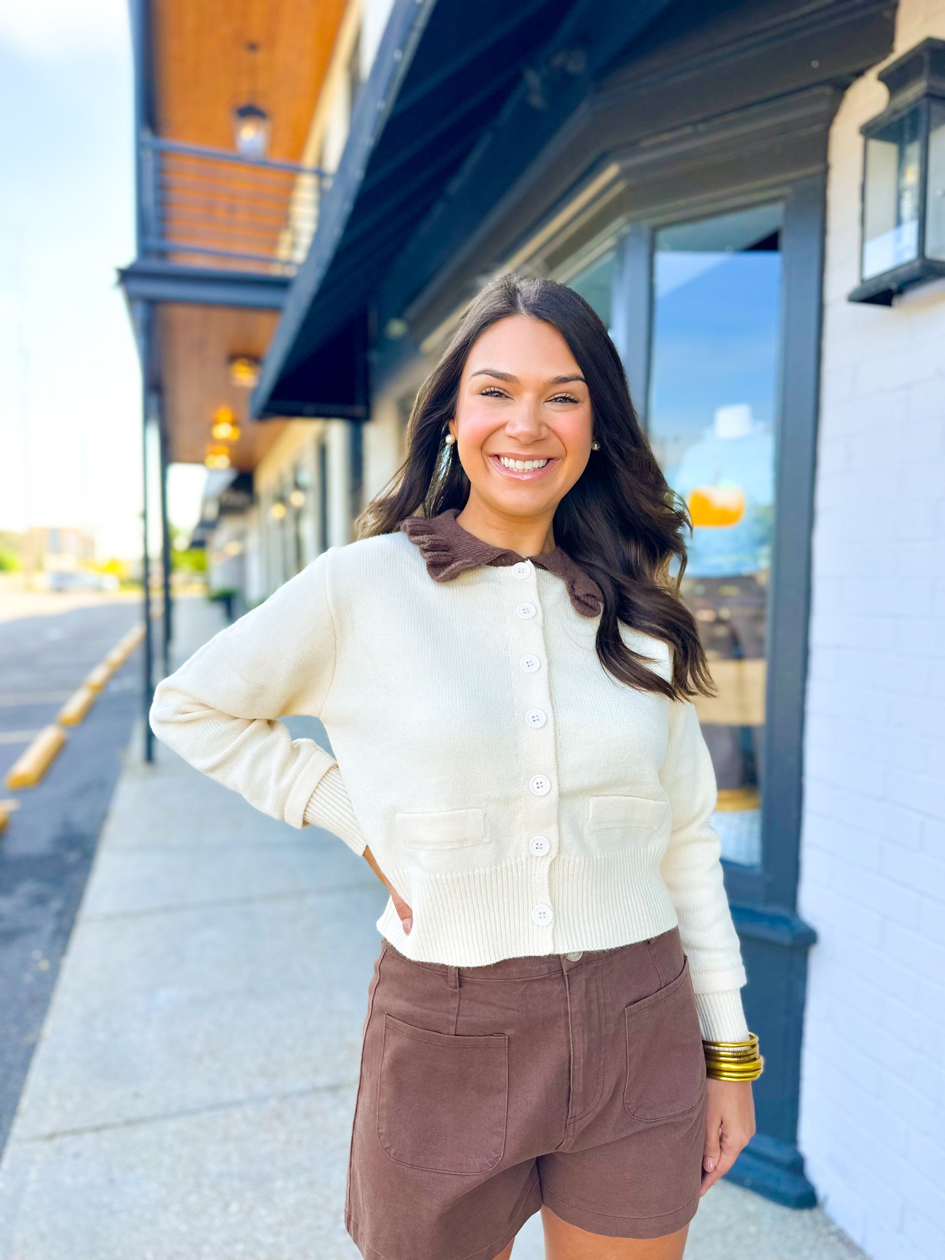 Solid twofer long sleeve cardigan featuring contrast ruffle edge collar button front closure. Unlined. Knit. Non-sheer. Lightweight.